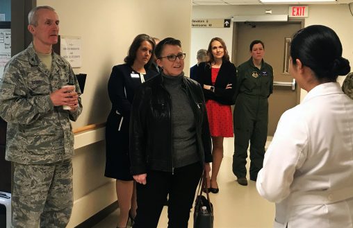 Wright State University President Susan Edwards visited Wright-Patterson Air Force Base to discuss the research, academic and vocational partnerships between the two institutions. Her tour included the Medical Center, where she spoke to several doctors.
