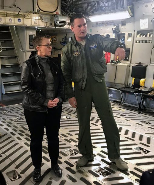 While visiting the 445th Airlift Wing President Susan Edwards received a briefing on the C-17 from Tech. Sgt. Jay Benedict.